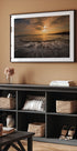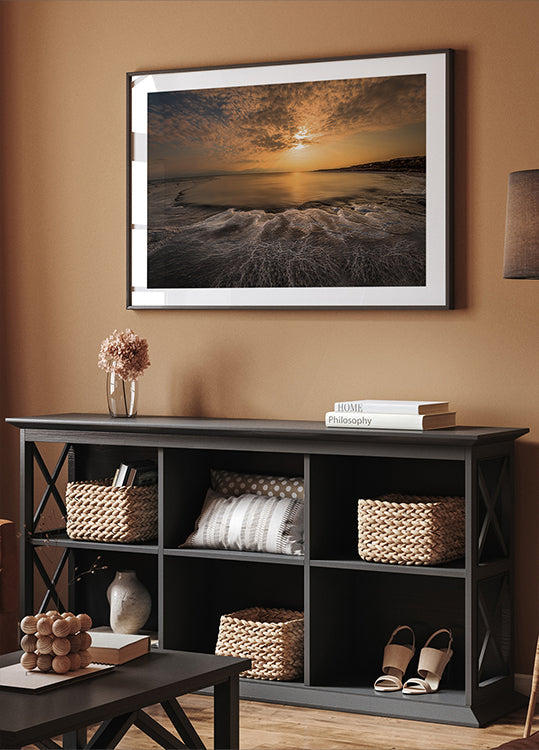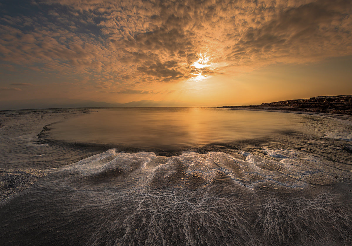Struktura soli Isama Telhami pozwala spokojnemu rytmowi morza wypełnić przestrzeń: miękkie fale obmywają piękną, jasną piaszczystą plażę, gdzie sól rysuje subtelne wzory wzdłuż krawędzi wody. Nad horyzontem unoszą się ciężkie chmury w stonowanych błękitach i piaskowych kolorach. Spokojny, minimalistyczny motyw zachęcający do kontemplacji.