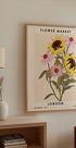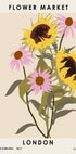 Uroczy kwiatowy plakat ze złotymi słonecznikami i delikatnymi różowymi kwiatami. To nowoczesne dzieło sztuki inspirowane stylem vintage celebruje kwiatowy splendor Londynu i żywą atmosferę lata.