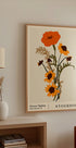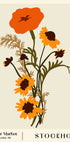 Minimalistyczny plakat kwiatowy w Sztokholmie z mocnymi pomarańczowymi i żółtymi kwiatami w czystych liniach graficznych. Ta grafika inspirowana stylem skandynawskim oddaje prostotę i naturalne piękno, idealne do nowoczesnych wnętrz.