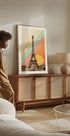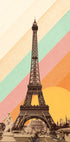 Przyciągająca wzrok inspirowana stylem retro ilustracja przedstawiająca Wieżę Eiffla w Paryżu, zestawiona na odważnym tle w tęczowe paski z ciepłym złotym słońcem. Połączenie fotografii vintage i żywych projektów graficznych tworzy nostalgiczną, ale nowoczesną grafikę inspirowaną podróżami, idealną dla miłośników Paryża, architektury i kolorowych dekoracji ściennych.