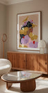 Ukryty za plakatem z żółtymi fioletowymi kwiatami