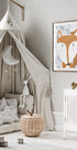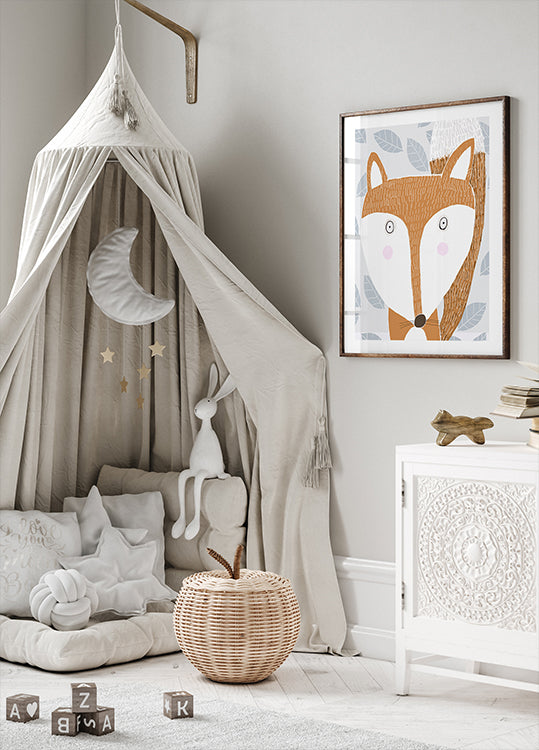 Uroczy rudy lis stoi pośrodku stylizowanego zimowego krajobrazu, otoczony motywami szarych liści, które tworzą spokojny, nordycki wzór. Ciepłe odcienie czerwieni kontrastują z chłodnymi odcieniami szarości i tworzą przytulną, graficzną atmosferę o zabawnym wyrazie. Stworzony przez artystkę Carlę Daly – idealny do pokojów dziecięcych i wystroju nordyckiego.