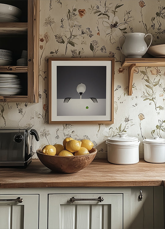 Zabawny i nieco zalotny plakat Wieteke de Kogel: pojedynczy zielony groszek jest kuszony łyżką i widelcem, co niemal nabiera osobowości. Czyste linie, świeży zielony akcent i stonowana grafika sprawiają, że motyw ten staje się nowoczesnym początkiem rozmowy w kuchni, jadalni lub kąciku kawiarni - z uroczym błyskiem w oku.
