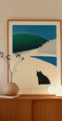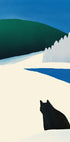 Samotny czarny kot wędruje przez cichy zimowy krajobraz ośnieżonych drzew i zamarzniętego brzegu rzeki pod chłodnym błękitnym niebem. Minimalistyczne kształty i ostry kontrast tworzą spokój i głębię, a sylwetka kieruje wzrok do przodu. Poetycki motyw natury autorstwa Little Dean, który emanuje stylowym bezruchem. Dyskretny hołd dla spokoju zimy.