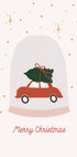 Wkrocz w świąteczną nostalgię dzięki tej ilustracji Menina Lisboa: czerwony samochód w stylu retro zwieńczony bujną choinką pędzi zaśnieżoną wiejską uliczką w stronę przytulnego wiejskiego domu, a wszystko to znajduje się w śnieżnej kuli. Wesoły napis Wesołych Świąt i odcienie w stylu vintage przynoszą ciepły, świąteczny urok. Delikatnie różowe niebo i wiecznie zielone akcenty lśnią przytulną zimową fantazją.