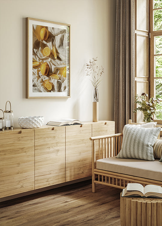 Plakat z żywymi cytrynami na teksturowanej tkaninie