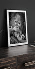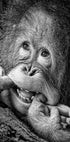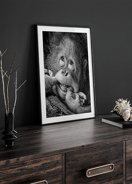 Humorystyczny i podnoszący na duchu czarno-biały portret młodego naczelnego o zabawnym wyrazie twarzy. Obraz oddaje radość, niewinność i bezczelny uśmiech, dodając ciepła i humoru każdej ścianie.