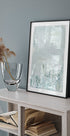 Et stille vinterlandskab udfolder sig i denne plakat: en hvidklædt skov, hvor granerne står tyste under frisk sne, mens fjerne bjergsilhuetter toner frem i den kolde luft. De kølige blå og hvide nuancer skaber ro og dybde—en elegant vinterstemning af casa cartissi. Perfekt som roligt blikfang i stuen, soveværelset eller entréen.
