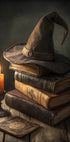 Tajemnicza i czarująca grafika przedstawiająca spiczasty kapelusz wiedźmy spoczywający na stosie starożytnych ksiąg zaklęć obok świecy. Ciepłe światło i bogate tekstury tworzą magiczną, nastrojową atmosferę - idealną dla dekoracji Halloween, miłośników fantasy lub wnętrz inspirowanych stylem vintage.