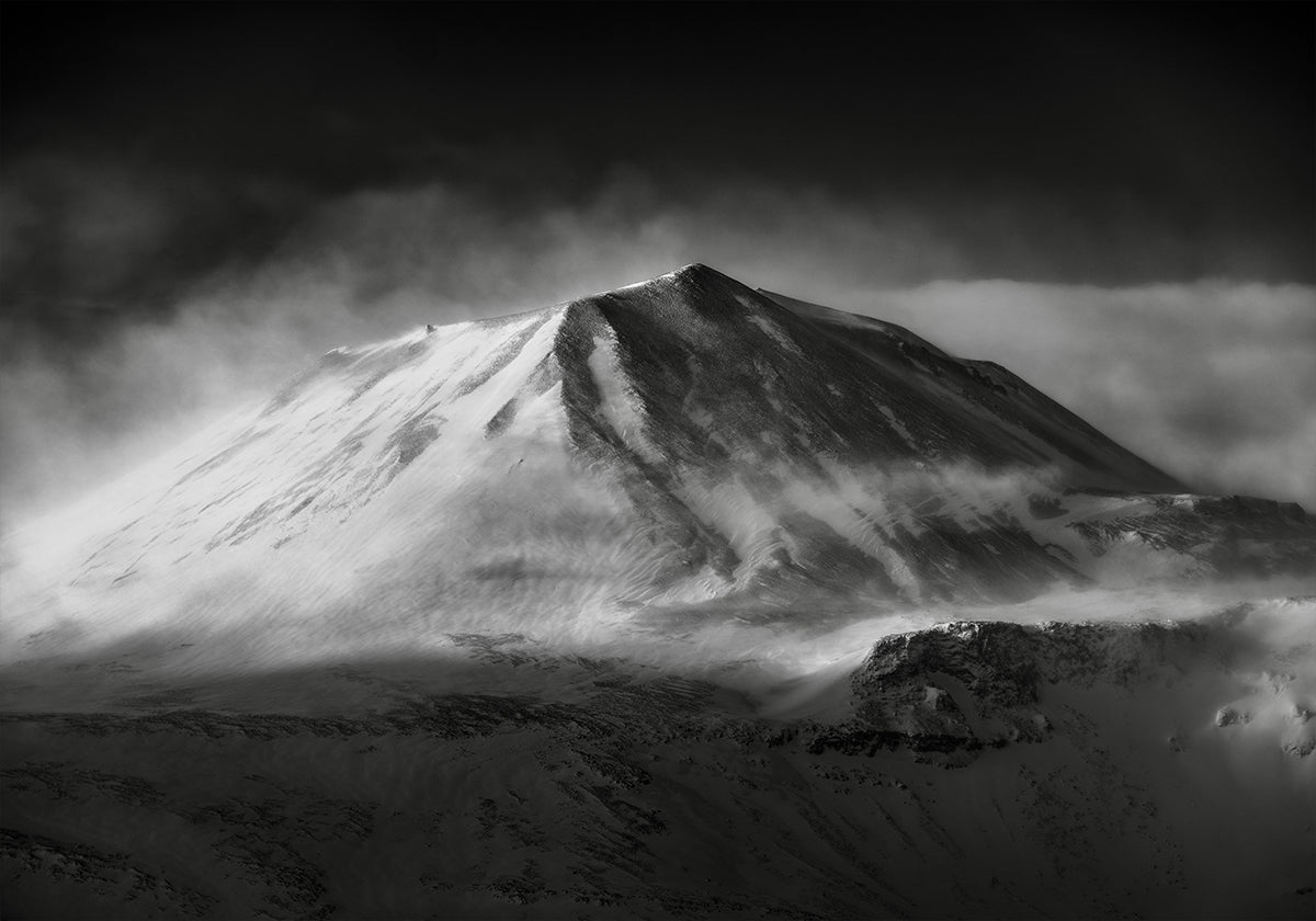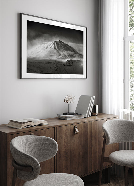 Surowy, zimowy grzbiet wznosi się na tle bladego nieba; Lodowoniebieskie odcienie i głębokie cienie podkreślają nieustępliwą naturę. Mgły unoszą się po stromych zboczach i nadają obiektowi tajemniczy spokój. Forbidden by Robert Bolton oddaje piękno zimna i zachęca do spokojnej refleksji. Mocny, minimalistyczny motyw dla domu.