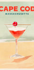 Żywy plakat w stylu retro z Cape Cod w stanie Massachusetts, przedstawiający klasyczny koktajl w kieliszku do martini zwieńczonym wiśnią. Dzięki plażowemu tłu i ciepłym odcieniom ta grafika oddaje nadmorski urok, relaks i ponadczasową letnią atmosferę, z której słynie Cape Cod.