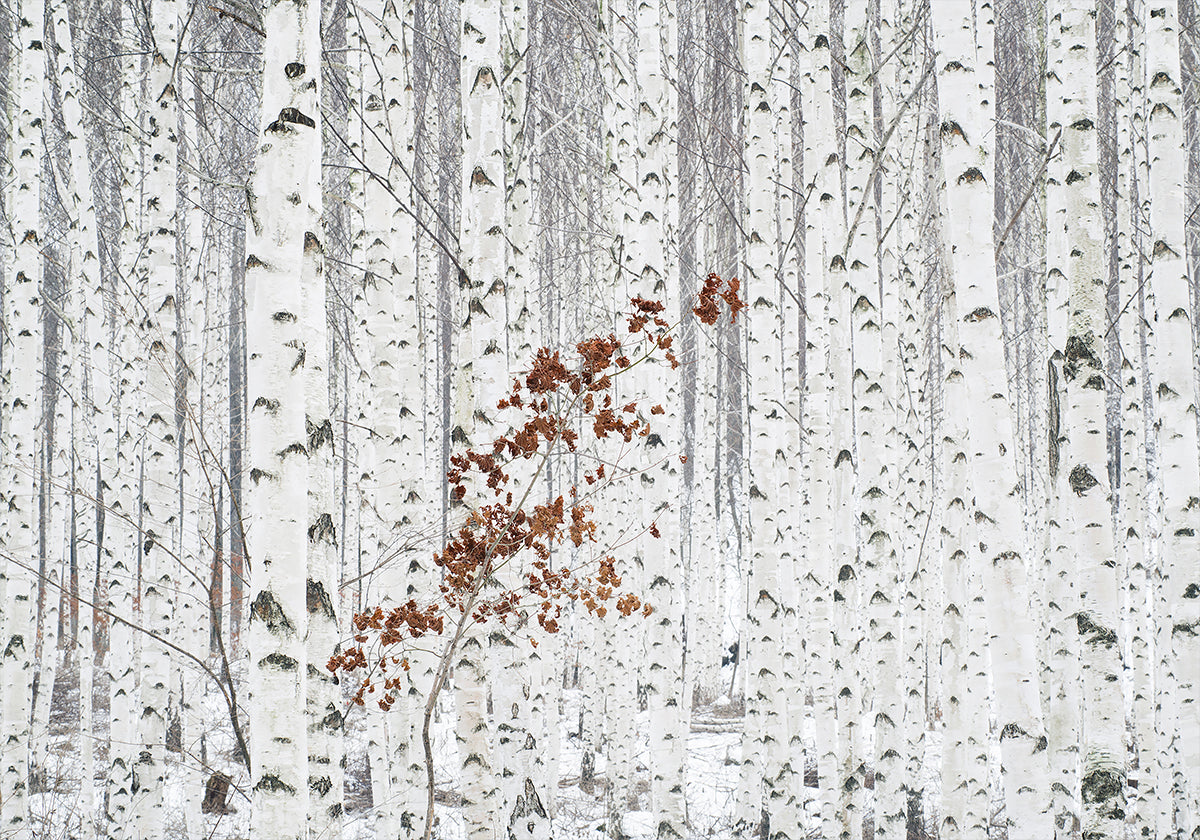 From White autorstwa HAN dong hee uchwycił świetlisty gaj brzozowy w wysokiej tonacji: smukłe białe pnie rytmicznie wznoszą się przez delikatną mgłę, z delikatnymi plamkami jesiennego złota zawieszonymi w powietrzu. Minimalistyczny, ale ciepły, przywołuje spokój, przestrzeń i cichy ruch – elegancki, nowoczesny ukłon w stronę nordyckiego światła leśnego. Idealny do spokojnych, nowoczesnych przestrzeni.