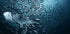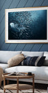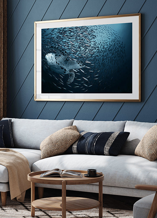 Oszałamiający podwodny plakat przedstawiający żółwia morskiego szybującego przez wirujące ławice ryb w głębokim błękitnym morzu. Ten obiekt, nakręcony na wyspach Similan w Tajlandii, oddaje piękno i chaos życia morskiego.