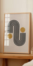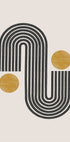 Nowoczesny, minimalistyczny abstrakcyjny projekt z odważnymi czarnymi zakrzywionymi liniami tworzącymi łuki w połączeniu ze złotymi okrągłymi kształtami na prostym tle. Łącząc estetykę retro z połowy stulecia ze współczesnym stylem, ta geometryczna grafika stanowi idealne uzupełnienie nowoczesnych wnętrz.