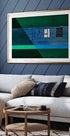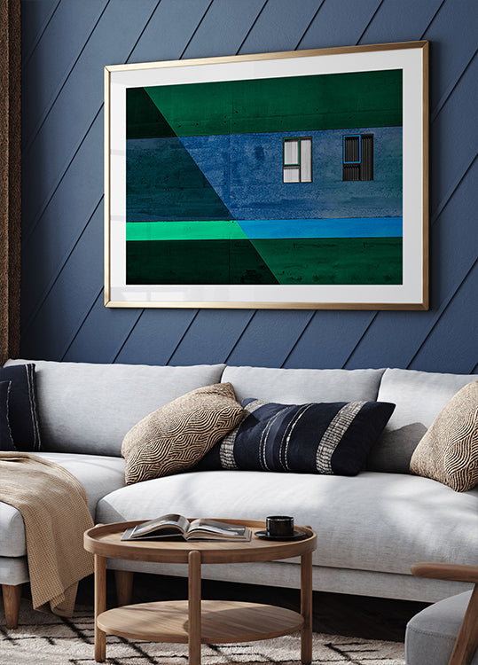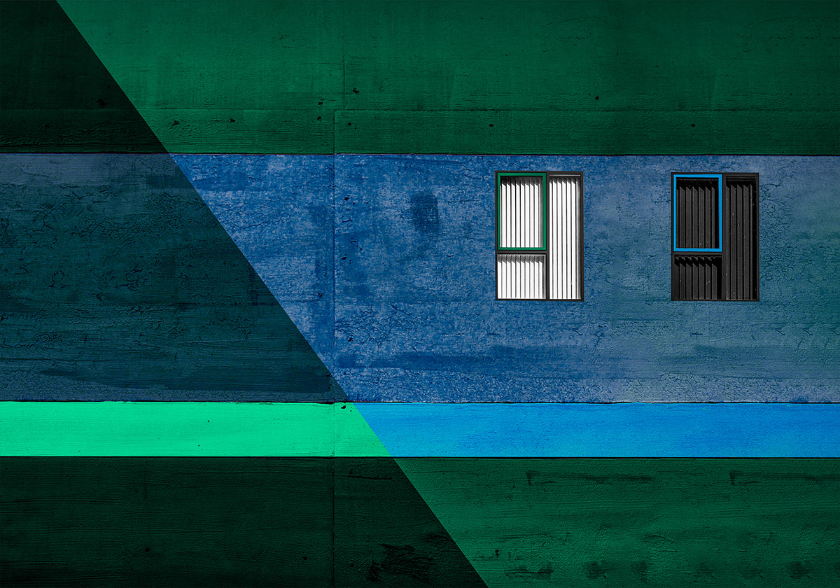 Odważne dzieło sztuki architektonicznej z dwoma oknami z odważnymi czarno-białymi żaluzjami, na tle teksturowanej ściany w głębokich błękitach i zieleniach. Ostre linie i geometryczna kompozycja tworzą nowoczesne abstrakcyjne dzieło pełne równowagi, kontrastu i wizualnych emocji.