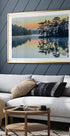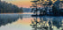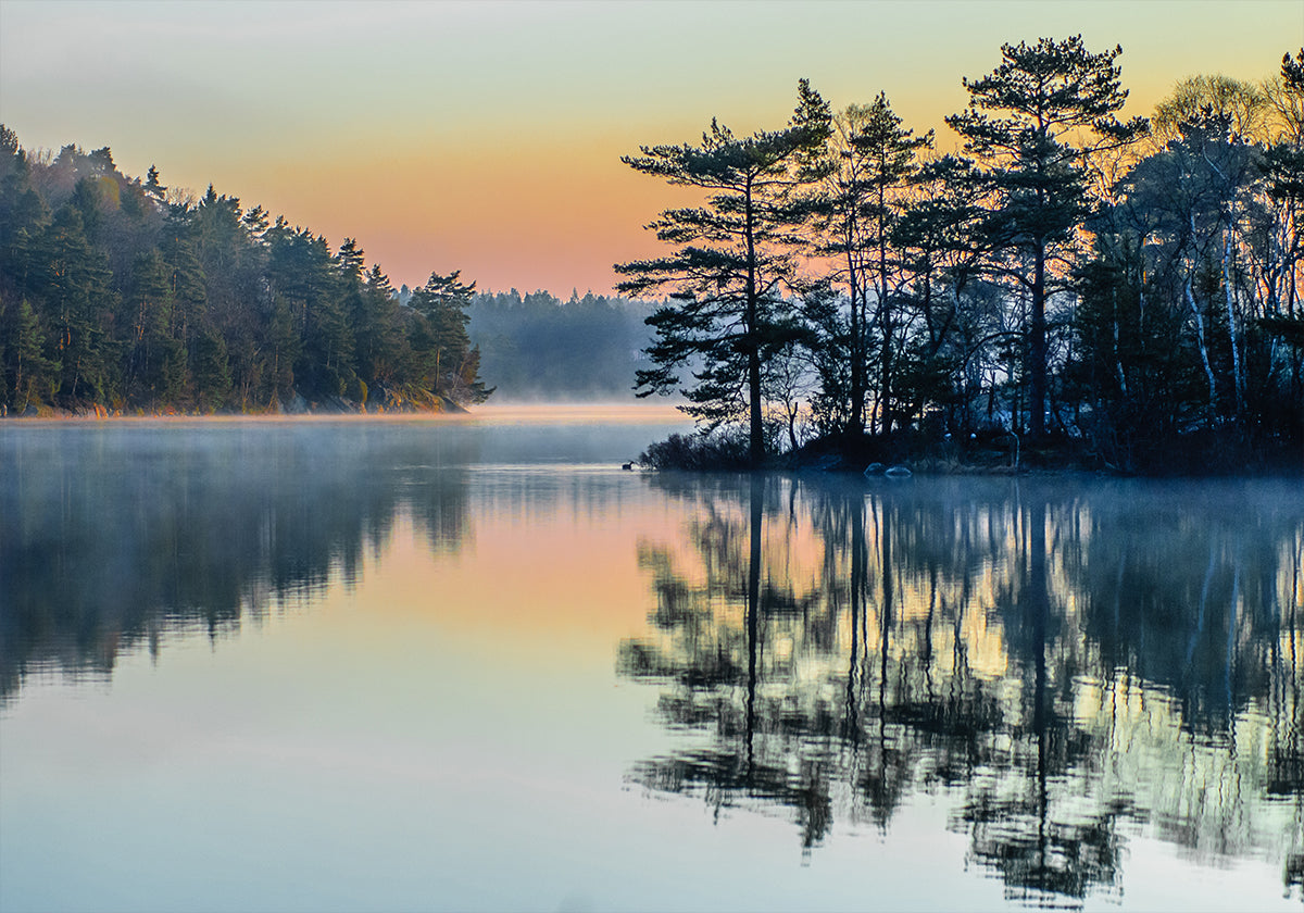 Spokojna scena nad jeziorem o świcie, uchwycona w Szwecji, z mgłą unoszącą się nad nieruchomą wodą. Odbicie sosen świeci w delikatnym świetle słonecznym i tworzy spokojną i medytacyjną atmosferę wypełnioną spokojem i harmonią.