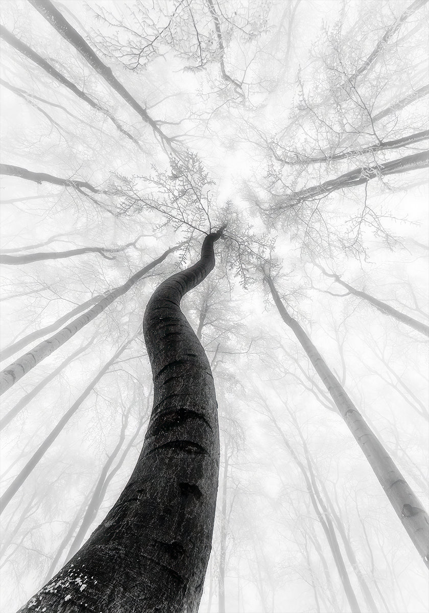 Spokojny zimowy moment uchwycony przez fotografa Toma Pavlaska: smukłe buki stoją w śniegu, spowite mgłą i szronem. Miękkie odcienie szarości i bieli tworzą głębię i spokój, podczas gdy powtarzające się odcienie rysują graficzne linie w krajobrazie. Minimalistyczna, nordycka atmosfera w domu. Idealny do pomieszczeń poszukujących przejrzystości, ciszy i natury.