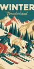 Winter Wonderland 2 autorstwa Andreasa Magnussona oddaje ponadczasowy urok plakatu podróżniczego w stylu retro: ośnieżone alpejskie szczyty, głębokie cienie w zimnym błękicie i świeże trasy narciarskie przecinające spokojną dolinę. Klimatyczny motyw zimowy, który wywołuje w domu poczucie przygody, nostalgii i przytulności. Idealny jako element przyciągający wzrok w salonie, przedpokoju lub kabinie.