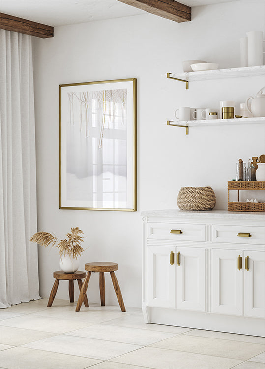 Winter Reflection autorstwa Laurentiu Pavela oddaje nordycką ciszę zimy: nagie drzewa stoją niczym graficzne sylwetki wzdłuż brzegów, doskonale odzwierciedlone w lodowatej wodzie. Jasna, jasno oświetlona atmosfera oraz ograniczona paleta odcieni bieli i szarości tworzą w pomieszczeniu spokój, harmonię i medytacyjną głębię. Poetycki zimowy krajobraz zachęcający do kontemplacji.