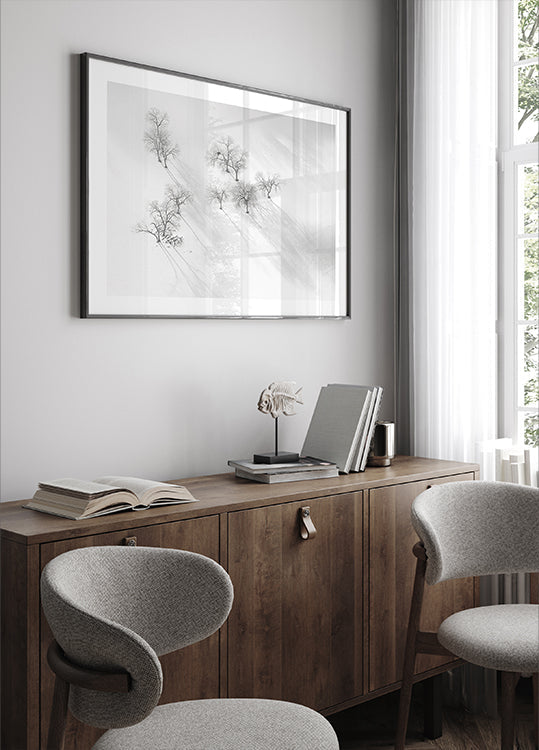 Zimowy sen – nieruchomy balet LINGLING GUAN przedstawia spokojny zimowy krajobraz, gdzie śnieg osiada niczym lekka zasłona wokół smukłych drzew. Stonowane odcienie i miękkie, chłodne oświetlenie tworzą poetycki spokój zachęcający do kontemplacji – wizualny balet ciszy i elegancji. Idealny do wprowadzenia poezji zimy do salonu.
